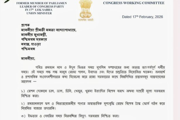 কলকাতা, ১৭ই ফেব্রুয়ারি ২০২৬: আসন্ন পবিত্র রমজান মাস ও ঈদুল ফিতর উপলক্ষে পশ্চিমবঙ্গের সাধারণ মানুষের সুবিধার্থে একগুচ্ছ প্রস্তাব পেশ করলেন সাবেক সাংসদ ও কংগ্রেস নেতা অধীর রঞ্জন চৌধুরী। আজ, মঙ্গলবার মুখ্যমন্ত্রী মমতা বন্দ্যোপাধ্যায়কে একটি চিঠি লিখে তিনি আটটি বিশেষ প্রশাসনিক পদক্ষেপ গ্রহণের আবেদন জানিয়েছেন।