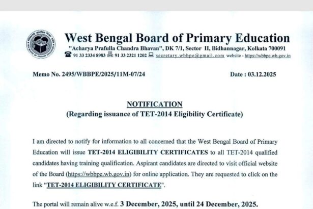 পশ্চিমবঙ্গ প্রাথমিক শিক্ষা বোর্ড (WBBPE) থেকে ০৩ ডিসেম্বর ২০২৫ তারিখে একটি অধিসূচনা (Memo No. 2495/WBBPE/2025/11-07/24) জারি করা হয়েছে। এতে টিচার এলিজিবিলিটি টেস্ট (TET)-২০১৪-এ উত্তীর্ণ সকল প্রার্থীদের জন্য যোগ্যতা সার্টিফিকেট ইস্যু করার বিষয়টি জানানো হয়েছে। নীচে বিস্তারিত বর্ণনা করা হলো: