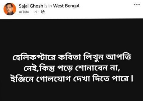 হেলিকপ্টার বিভ্রাট: অতীতে একাধিকবার যান্ত্রিক গোলযোগ বা আবহাওয়ার কারণে মুখ্যমন্ত্রীর হেলিকপ্টার জরুরি অবতরণ (Emergency Landing) করতে হয়েছে। সজল ঘোষ সম্ভবত সেই প্রসঙ্গটিকেই খোঁচা দিয়েছেন।